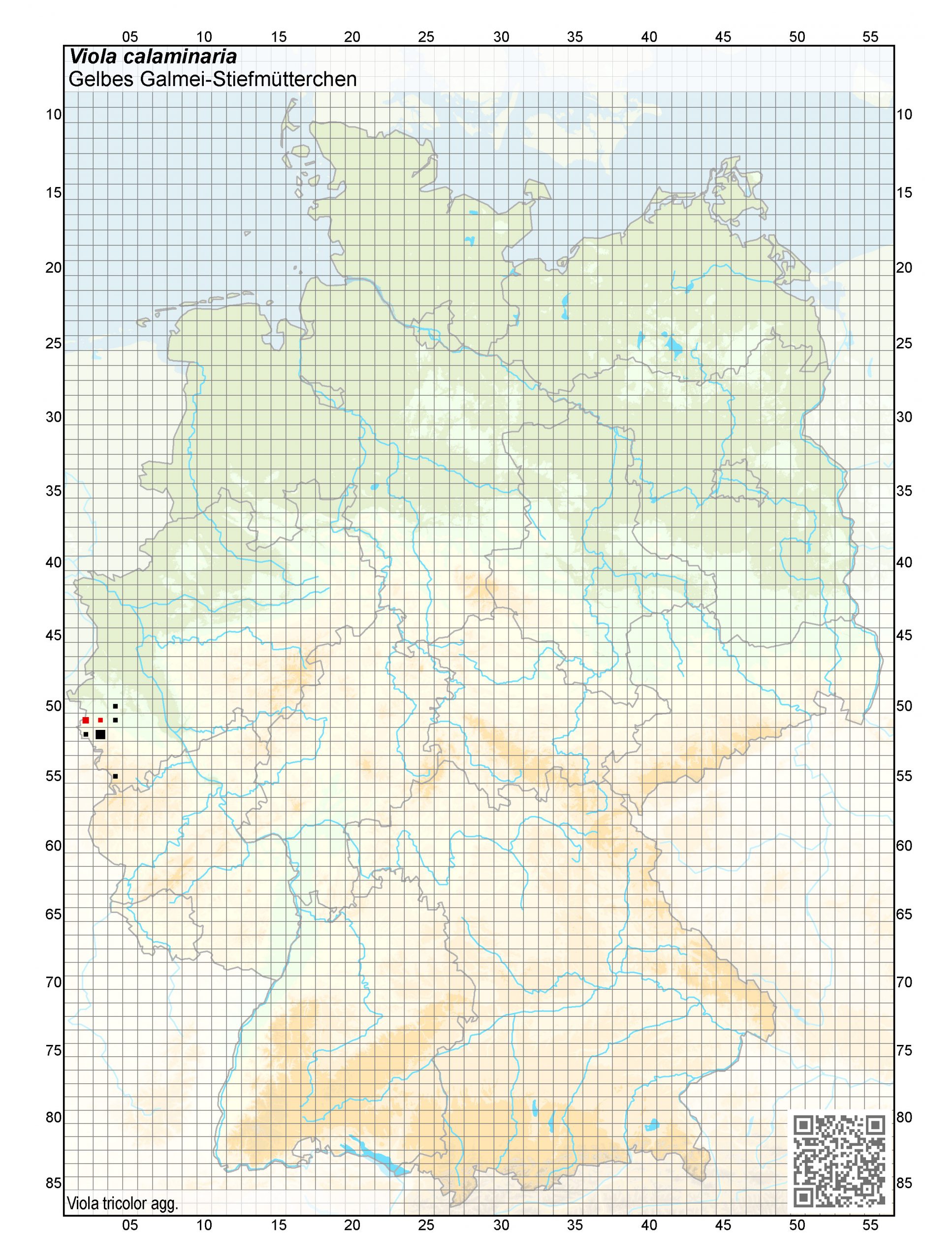 Insgesamt überdecken 3.000 Grundfelder der Topographischen Karte 1:25.000 (TK) das Gesamtgebiet Deutschlands. Jedes Grundfeld ist in vier Quadranten eingeteilt. Ein Quadrant ist ca. 6 x 5,6 km groß. Die quadratischen Symbole stellen Viola calaminaria als einheimische Art vor. Die rote Farbe der Symbole dokumentiert Kartierungen bzw. Erfassungsräume vor 1950, die schwarze Farbe nach 1980. Die Größe der Symbole verdeutlicht die Häufigkeit der Funde innerhalb der TK-Raster. Das größte Symbol repräsentiert einen Nachweis in allen vier Quadranten.