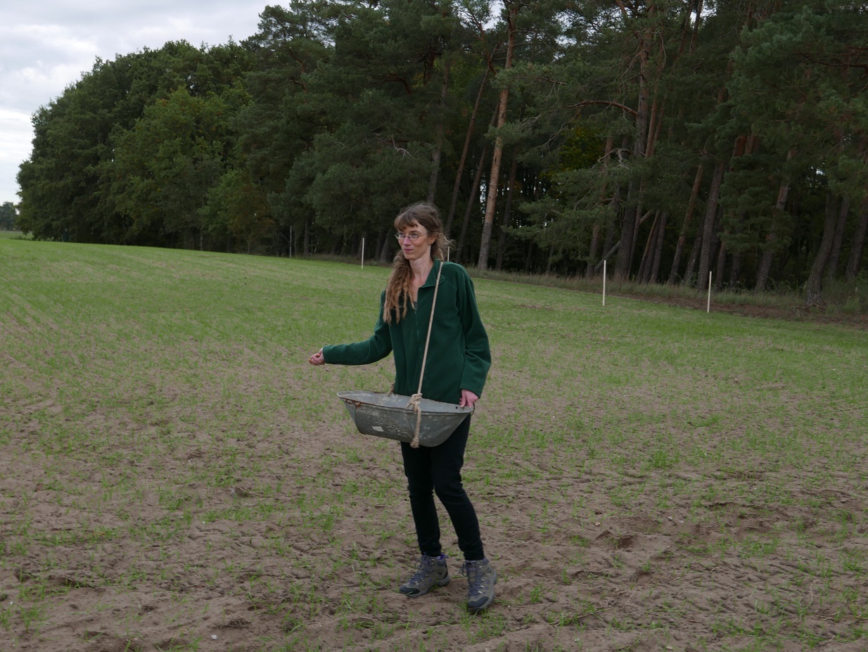 Am 22. Oktober 2020 brachten die Potsdamer Projektpartner das Saatgut aus. Es wurde traditionell per Handsaat auf die bereits mit Wintergetreide bestellte Fläche ausgesät. Denn – der Lämmersalat hat sich mit seinem Lebenszyklus den Wintergetreidearten angepasst. Vor dem Winter entwickelt sich die markante, dem Erdboden aufliegende Blattrosette.