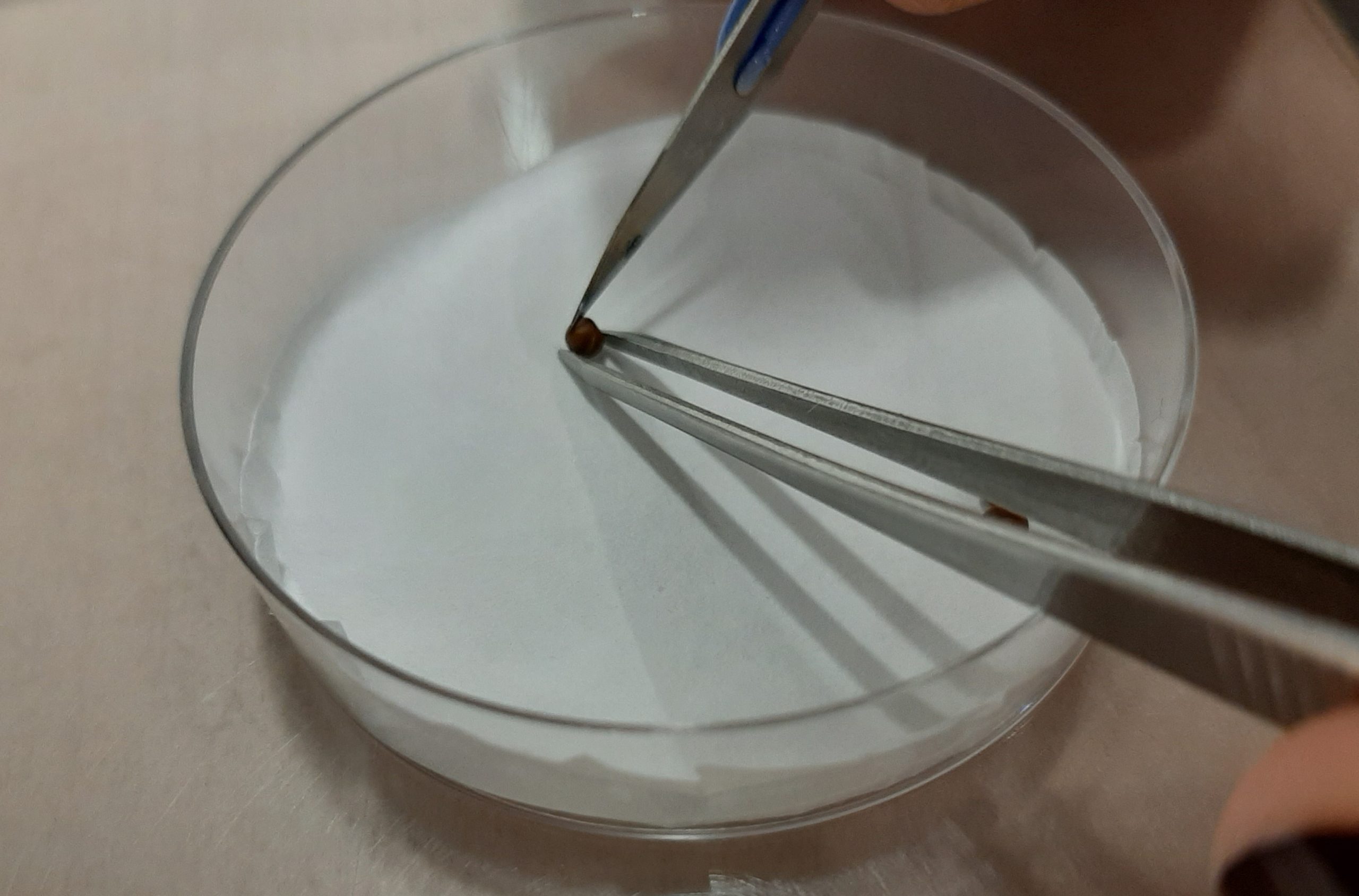 Die Voraussetzung für die Keimung ist, dass der Samen Feuchtigkeit aufnehmen kann. Allerdings sind die Samenschalen einiger Arten undurchlässig für Wasser. Sie sind mit einer dicken Schale oder von einer wachsigen Schicht überzogen und erschweren dadurch das Eindringen von Feuchtigkeit in das Sameninnere. Bei solchem Saatgut empfiehlt es sich die Samenschale zu behandeln, um die Wasseraufnahme zu ermöglichen. Die Kolleginnen und Kollegen im Labor ritzen entweder die Samenschale mit einem Skalpell oder einer Rasierklinge an, oder sie ziehen den Samen zum Aufrauhen über Schmirgelpapier.