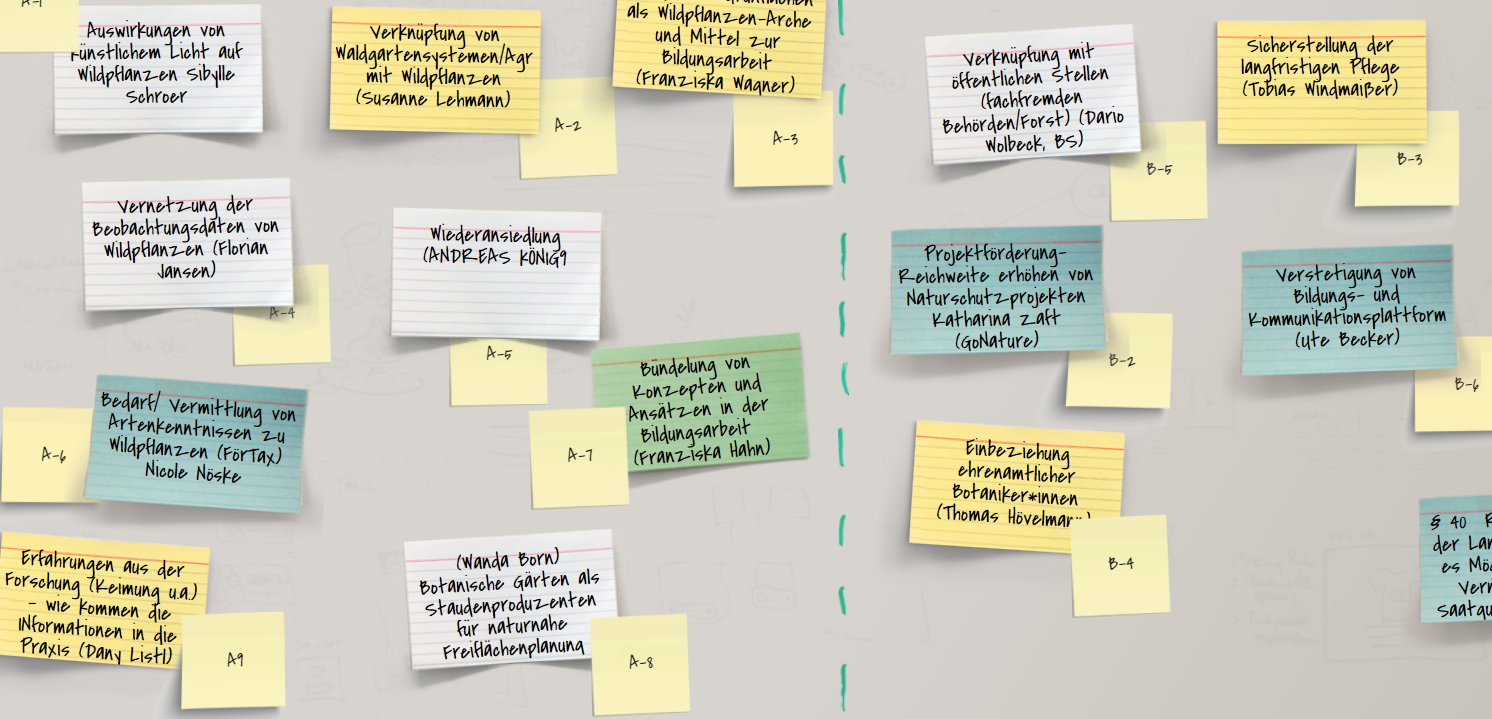 Die Themen der Workshops entstanden ergebnisoffen aus dem Kreis der Teilnehmenden. Wie vielfältig in den Workshops debattiert wurde, lässt ein Blick auf die Pinnwand (siehe Foto) erahnen. Die Akteure entwickelten Ideen zu gemeinsamen Aktionen und Kooperationen. In Vorträgen stellten Mitarbeitende der beiden Projekte „Tatort Straßenbeleuchtung“ und „Quervernetzung Grünes Band“ ihre Arbeit vor. In einer Podiumsdiskussion mit Dr. Josef Tumbrinck (Bundesministerium für Umwelt, Naturschutz und nukleare Sicherheit) und Dr. Detlev Metzing (Bundesamt für Naturschutz) konnten sich alle davon überzeugen, dass das Thema „Biodiversität“ in den Ministerien vermehrt wahrgenommen wird. Damit bekommt auch der Wildpflanzenschutz auf hoher politischer Ebene größeres Gewicht. Nun gilt es, mit allen Beteiligten Ankerpunkte für Wildpflanzenthemen bei den Ministerien zu finden und gemeinsam die Projektarbeit in Daueraufgaben zu überführen.
