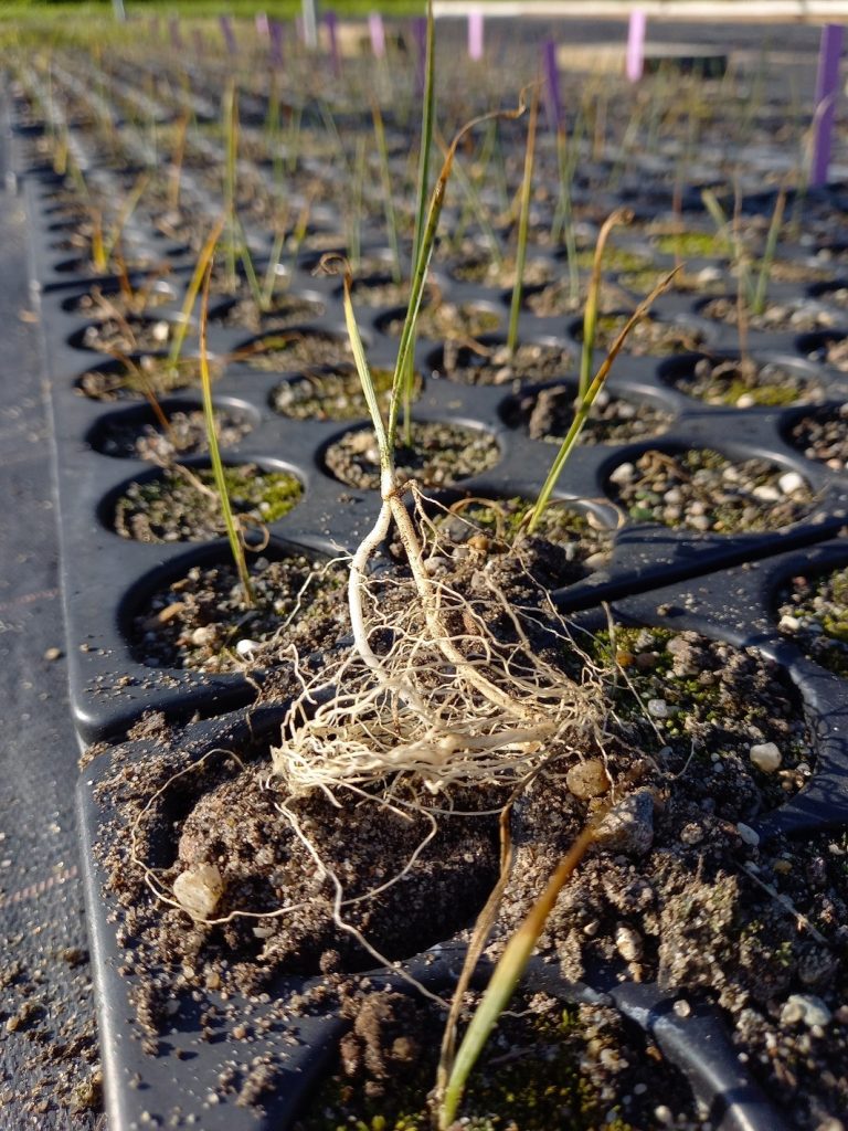 lautete die Anleitung der WIPs-Kolleg*innen. Doch das gestaltete sich für die oft ungeübten Finger der Beteiligten gar nicht so leicht. Die Trauben-Graslilie gehört zu den Hemikryptophyten. Ihr oberirdischer Spross stirbt vor der Vegetationsruhe, in der ungünstigen kalten Jahreszeit, weitestgehend ab, während die Erneuerungsknopse an der Erdoberfläche liegt. Hier war also Augenmaß beim Pflanzen gefragt. Das wird deutlich, wenn man sich die Jungpflanzen auf dem Foto betrachtet. Kaum Spross, dafür viel Wurzelwerk.