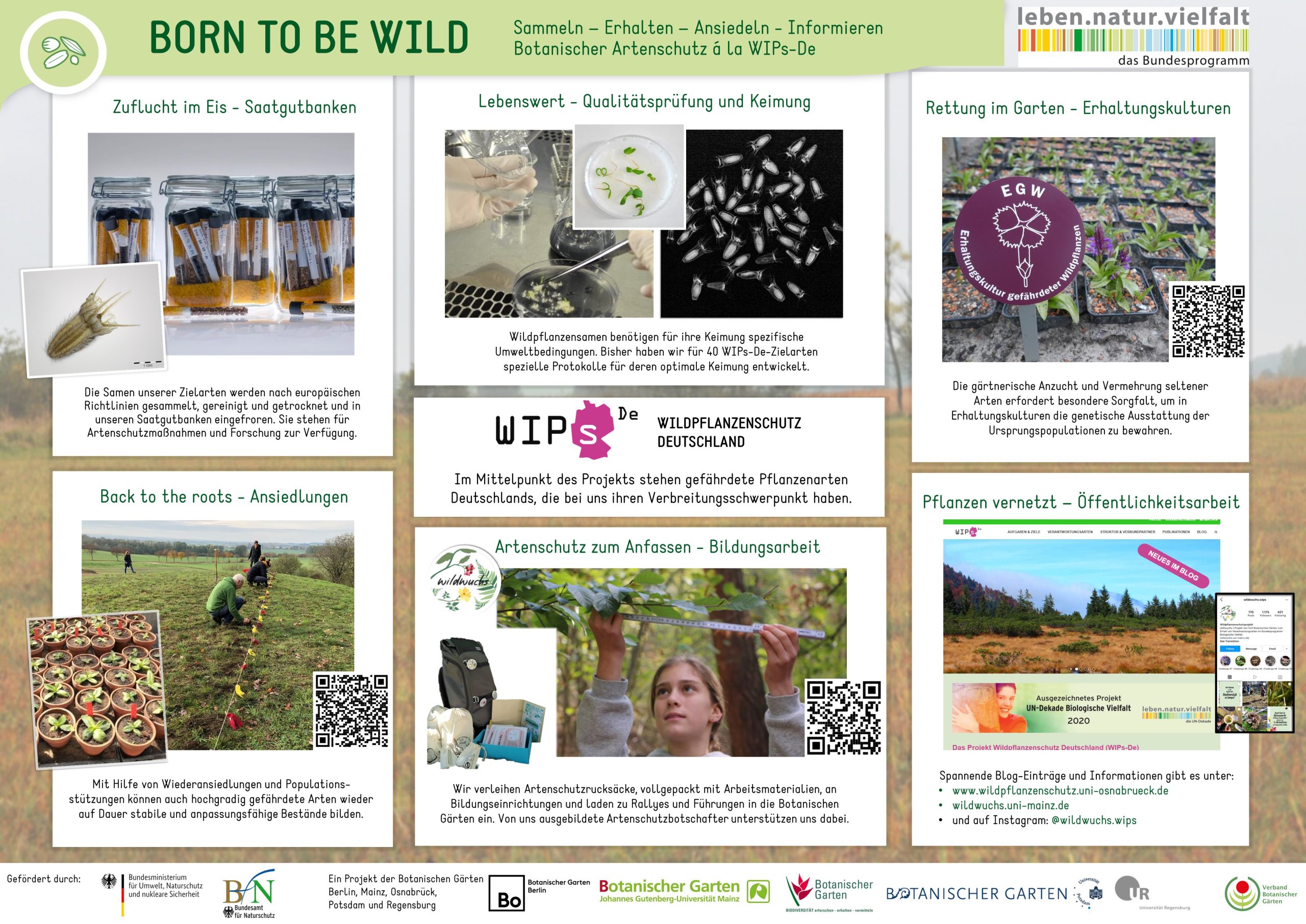 Die Themen Schutz der Artenvielfalt, Taxonomie, Monitoring, Datenaustausch, Artenkenntnis und Bildung wurden in vielfältigen Programmformaten aufgenommen. Neben Plenarvorträgen, Kurzvorträgen, Workshops und Austauschrunden gab es auch eine Poster-Ausstellung. Unser Projektposter „Born to be wild“ (siehe Foto) konnten die Konferenzteilnehmenden an den beiden Tagen in einer Ausstellung besuchen. Ausführlicher präsentierte Daniela Listl unser Projekt während einer Poster-Session und kam mit den Anwesenden in einen regen Informationsaustausch über den Botanischen Artenschutz á la WIPs-De.