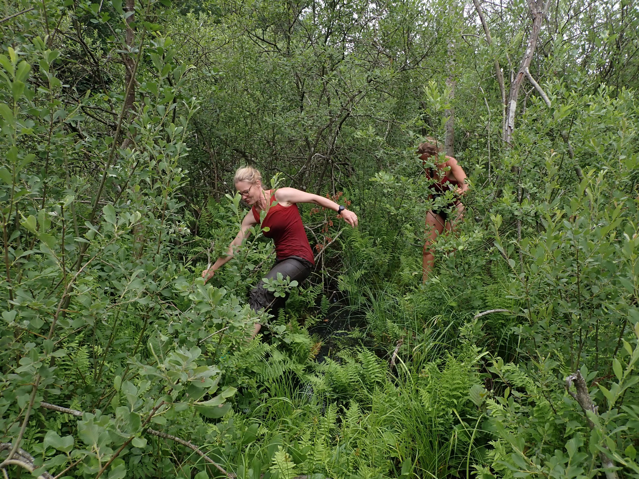 Ohne eine kleine Wat- und Schwimmeinlage hätten es unsere Kolleginnen vom Botanischen Garten Berlin nicht zum neu entdeckten Vorkommen des Zierlichen Wollgrases (Eriophorum gracile) in Brandenburg geschafft. Erst ging es durch einen Sumpf – ohne Sichttiefe und mit feinstem Modder – dann durch dichtes Weidengebüsch. Am Ziel angekommen wurden sie reich belohnt. Wollgräser mit Früchten im perfekten Reifestadium leuchteten ihnen entgegen. Saatgut wurde eingesammelt, sowohl für die Einlagerung in der Dahlemer Saatgutbank als auch für die Anlage von Erhaltungskulturen im Botanischen Garten Rostock .