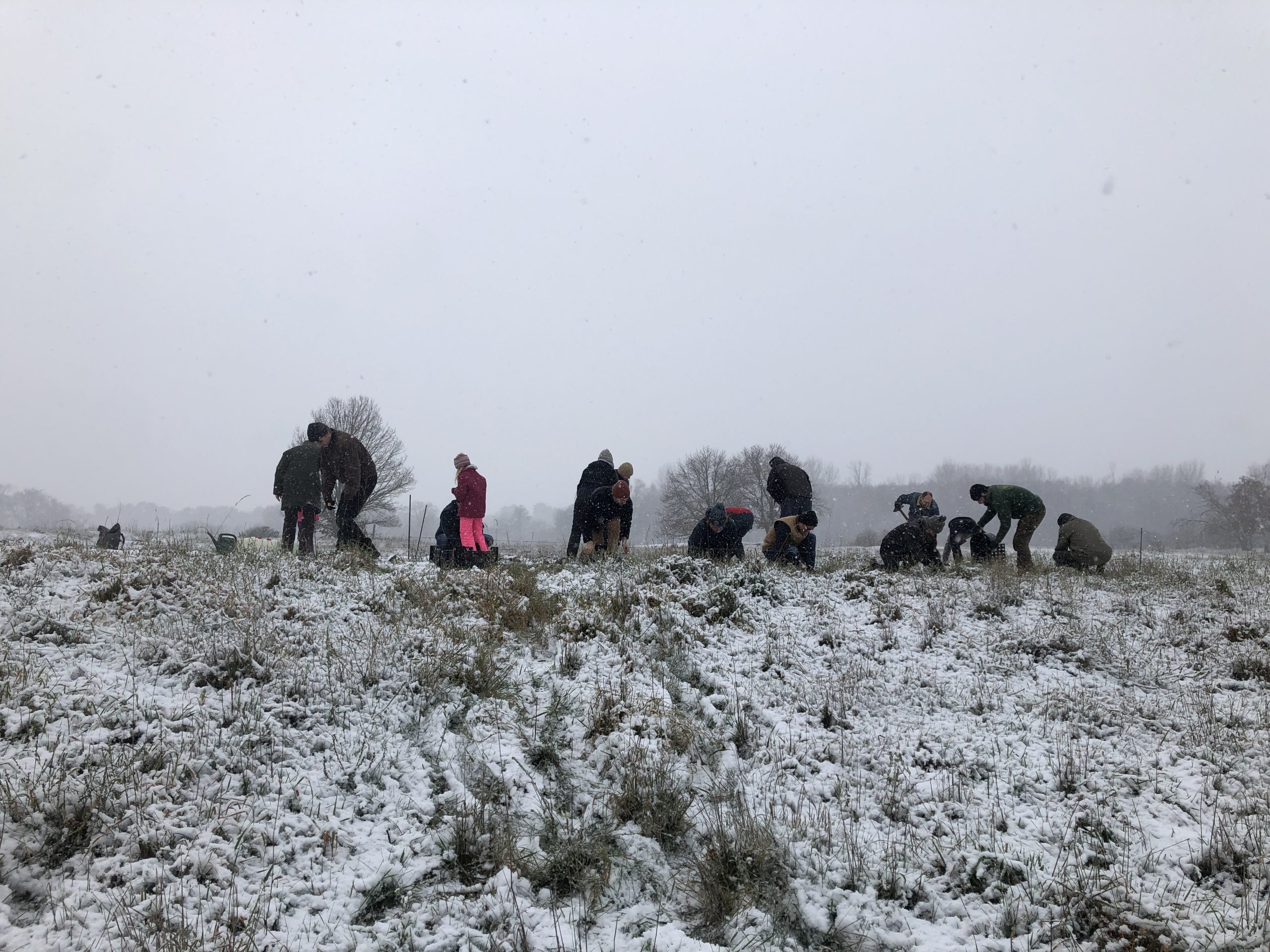 Trotz des ersten Frosts und Schneefalls und trotz des Termins an einem Sonntagvormittag trafen sich Ende November rund 15 Freiwillige, um unsere Kolleg*innen aus Potsdam bei der Pflanzung von 300 Pflanzen der Grauen Skabiose (Scabiosa canescens) zu unterstützen. Die öffentliche Pflanzenausbringung war eine gemeinsame Aktion unseres WIPs-Projektes und des Projektes LIFE-Trockenrasen (Stiftung NaturSchutzFonds Brandenburg) in den Kleinen Jahnbergen im Osthavelland. Und dank der großartigen Unterstützung konnten sich alle Beteiligten schon nach 1 Stunde 30 Minuten mit heißen Getränken und Gebäck stärken.