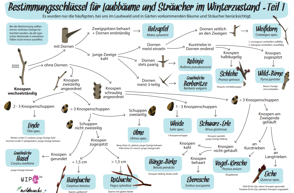 Sorgen Sie auf Ihrem nächsten Winterspaziergang doch einmal für Abwechslung. Unsere Mainzer Kolleginnen haben einen Bestimmungsschlüssel für Laubbäume und Sträucher im Winterzustand zusammengestellt. Hier sind zum Beispiel auch die Verantwortungsarten Rotbuche, Hainbuche, Weißdorn und Berg-Ahorn zu finden.