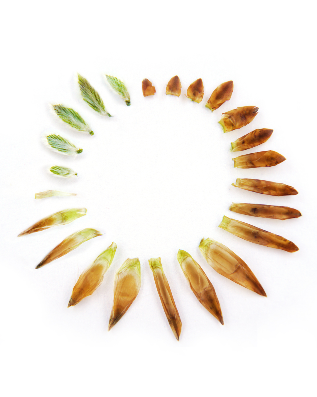Geschützt bereiten sich in den Knospen die nächste Generation Blüten, Blätter und Triebe auf den kommenden Frühling vor. Bis ins kleinste Detail ist die spätere Gestalt der Blätter um ein Vielfaches verkleinert angelegt. Beginnend von oben (Bildmitte) im Uhrzeigersinn zeigt unser Foto eindrucksvoll was alles in einer Blattknospe der Rotbuche (Fagus sylvatica) steckt. Von außen nach innen besteht die Knospe zunächst aus rotbraunen Schuppenblättern, die dicht gepackt übereinander liegen. Sie schützen die grünen Laubblätter im Inneren der Knospe. Diese sind schon fertig angelegt und als „echte“ Blätter in Miniaturausgabe zu erkennen. Wenn im Frühling die Knospen austreiben, fallen die Schuppenblätter ab und die Laubblätter wachsen bis zu ihrer endgültigen Größe heran.