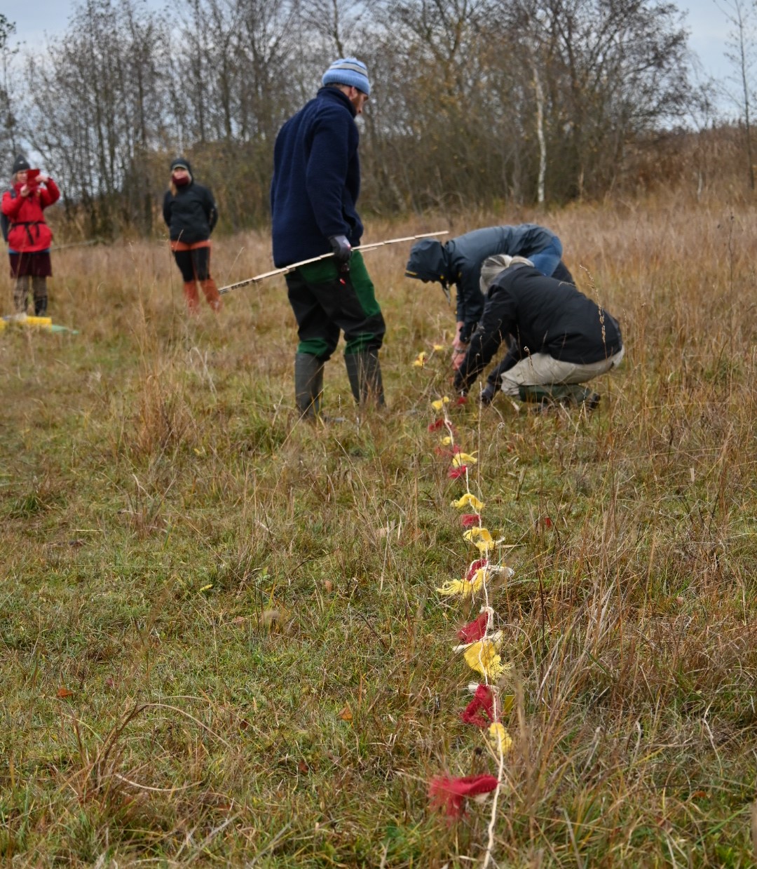 Die Kolleg*innen des Botanischen Gartens Berlin waren Ende November 2023 aktiv und haben alles dafür vorbereitet. Sie brachten in mühevoller Kleinarbeit 34.000 Korn des Sumpf-Kranzenzians (Gentianella uliginosa) in den Boden. Auf insgesamt 17 Versuchsflächen, die jeweils wiederum aus 10 Teilflächen bestanden. Mit Hilfe eines ausgeklügelten standardisierten Ansaatverfahrens in markierten Reihen. In jeder Reihe wurden im Abstand von 2 Metern kleine Teilflächen der Größe 25 x 25 cm mit einer Hacke manuell gegrubbert, um Rohboden zu schaffen. In die freigelegten Teilflächen wurden 200 Korn eingesät. Unterstützung erhielten die Kolleg*innen von zwei Teilnehmenden des VBG- Qualifizierungskurses „Gärtner*in im Botanischen Artenschutz“, die im Rahmen ihrer Hospitation die Ansiedlungsmethode kennen lernen wollten.