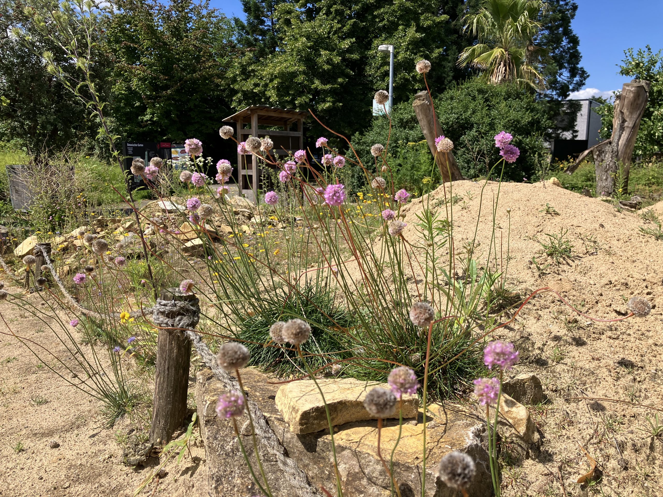 Die Gewöhnliche Grasnelke (Armeria maritima) bietet aufgrund ihrer langen Blütezeit vom Frühsommer bis in den Herbst als Küsten- und Magerrasenart vielen Nektar und Pollen suchenden Insekten eine verlässliche Nahrungsquelle. Hier blüht sie im Sandarium des Botanischen Gartens der Universität Osnabrück. Die Osnabrücker Kollegen gestalteten ihre WIPs-Erhaltungskulturen in neuen Beet-Anlagen, mit dem Ziel regionale Lebensräume darzustellen. Wie beispielsweise die „Mageren Sandheiden“ Niedersachsens, in denen neben der Grasnelke auch die WIPs-Verantwortungsarten Genista pilosa und Carex arenaria zu sehen sind.